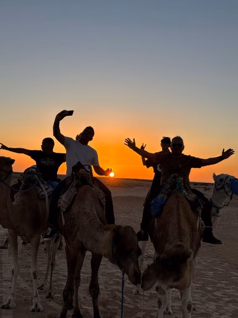 Nel pomeriggio, la rotta è proseguita fino a Douz, la “porta del deserto”. Dopo il pranzo e un po’ di relax in piscina all’hotel Sun Palm, la carovana ha vissuto uno dei momenti più magici del viaggio: il tramonto tra le dune, a dorso di cammello.