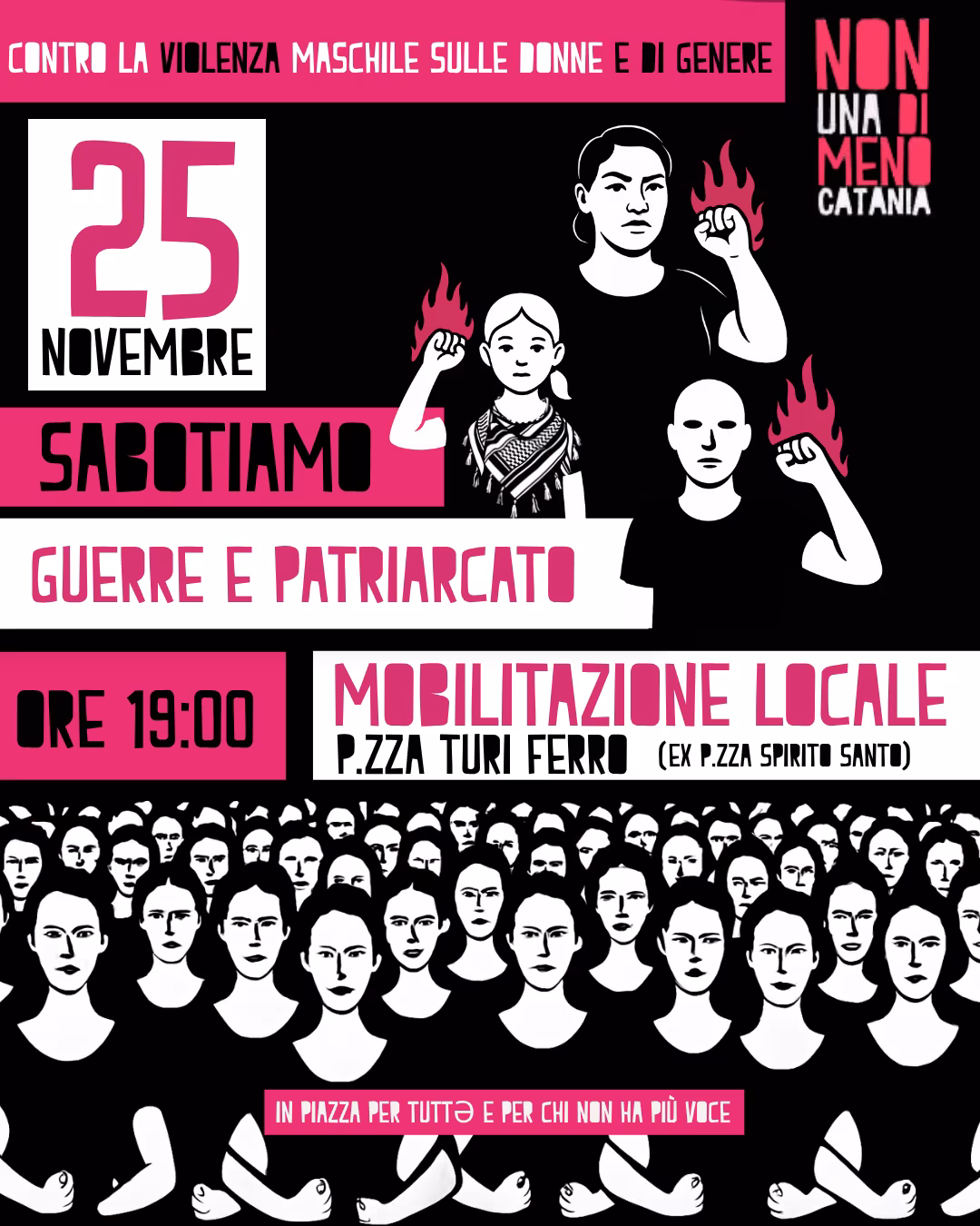 In occasione della Giornata internazionale contro la violenza maschile sulle donne e di genere, Non Una di Meno Catania annuncia una manifestazione cittadina che si terrà a partire dalle ore 19 in Piazza Turi Ferro (ex Piazza Spirito Santo). Una chiamata alla partecipazione pubblica che, quest’anno, assume un significato particolare: «La violenza patriarcale continua a permeare ogni spazio delle nostre vite», afferma Mariagiovanna di Non Una di Meno Catania, denunciando l’impatto della violenza nelle case, nei luoghi di lavoro, nelle scuole e nei servizi destinati all’assistenza.