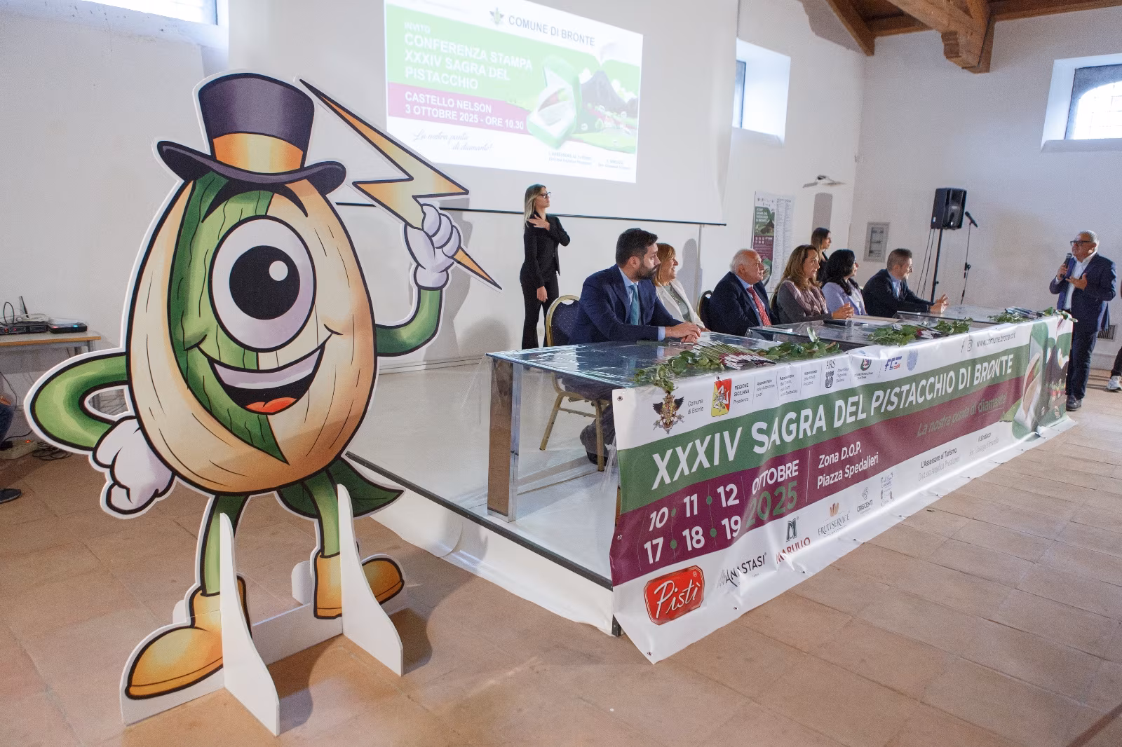 BRONTE – Alla XXXIV edizione della Sagra del Pistacchio di Bronte, in programma dal 10 ottobre 2025, farà il suo debutto Mr Bront, la nuova mascotte ufficiale della manifestazione. Ideata da Quater Srl e presentata alla stampa, la figura rappresenta in modo originale l’anima della cittadina etnea, fondendo mito, storia e tradizione in un’unica immagine iconica.