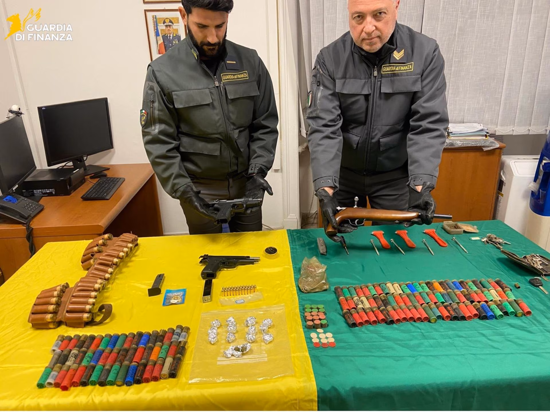 La Guardia di Finanza ha rinvenuto e sequestrato pistole, munizioni e marijuana nascosti in un casolare abbandonato all’interno di un parco nel quartiere Monte Po, a Catania.