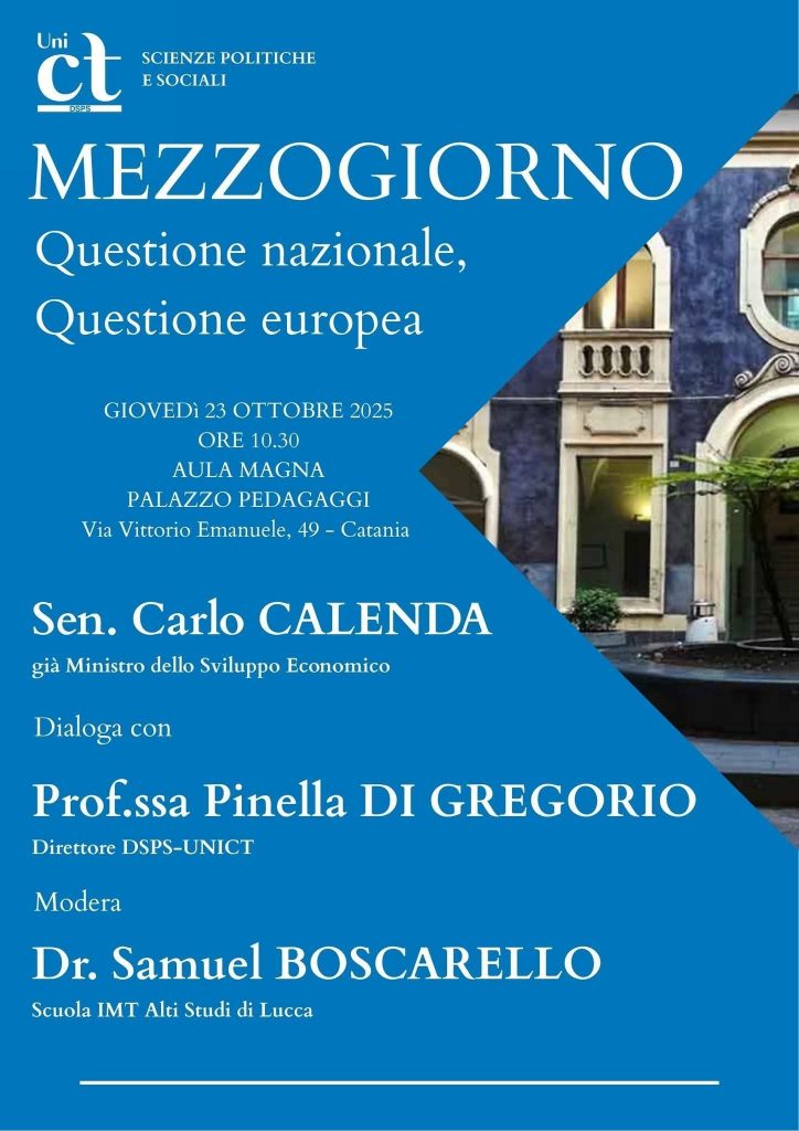 L’evento offrirà un’occasione di dialogo aperto sui grandi temi che attraversano la società italiana: coesione territoriale, competitività economica, politiche europee per lo sviluppo e il rilancio del Mezzogiorno. Calenda interverrà in un confronto con la professoressa Pinella Di Gregorio, Direttrice del DSPS-UniCT, mentre il dibattito sarà moderato dal dottor Samuel Boscarello della Scuola IMT Alti Studi di Lucca.