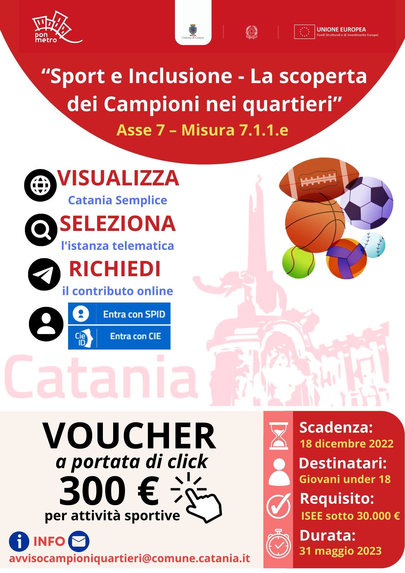 L’iniziativa è destinata alle famiglie con figli minori tra 6 e 17 anni residenti a Catania, con Isee non superiore ai 30.000 euro ed è stata promossa dalla Direzione Politiche Comunitarie “Servizio attuazione con Fondi U.E. di progetti di riqualificazione urbana e transizione green – Sport”.L’obiettivo è quello di promuovere lo sport tra i bambini e gli adolescenti come momento di benessere fisico, mentale e di socializzazione, favorendo l’inclusione e la partecipazione ad esperienze di gruppo e di condivisione, nel rispetto delle regole, dell’altro e della sicurezza e scoprire i “campioni” nei quartieri cittadini.