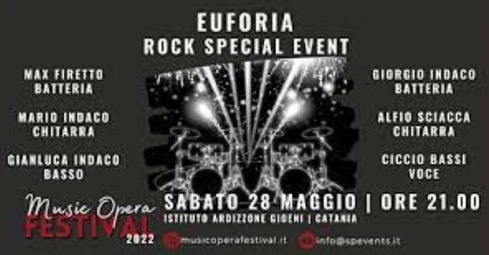 Un sabato sera da brividi. Alle ore 21,00 a Catania. Un vero e proprio show che combina il rock più travolgente ad effetti speciali psichedelici con suoni ancestrali. Si chiama EUFORIA ed è uno show che vedrà sul palco cinque musicisti e un vocalist, che proporranno musiche originali che verosimilmente, renderanno impossibile al pubblico stare seduto. Ben due le batterie con le bacchette scatenate di Max Firetto e Giorgio Indaco. Alle chitarre Mario Indaco e Alfio Sciacca; al basso Gianluca Indaco e la voce graffiante di Ciccio Bassi. Sul palco inoltre spettacolari gong, che uniranno i loro suoni ipnotici al rock più scatenato. Insomma, una serata unica, tutta da gustare all’istituto Ardizzone Gioeni di via Etnea, a Catania. Come detto a partire dalle ore 21,00.