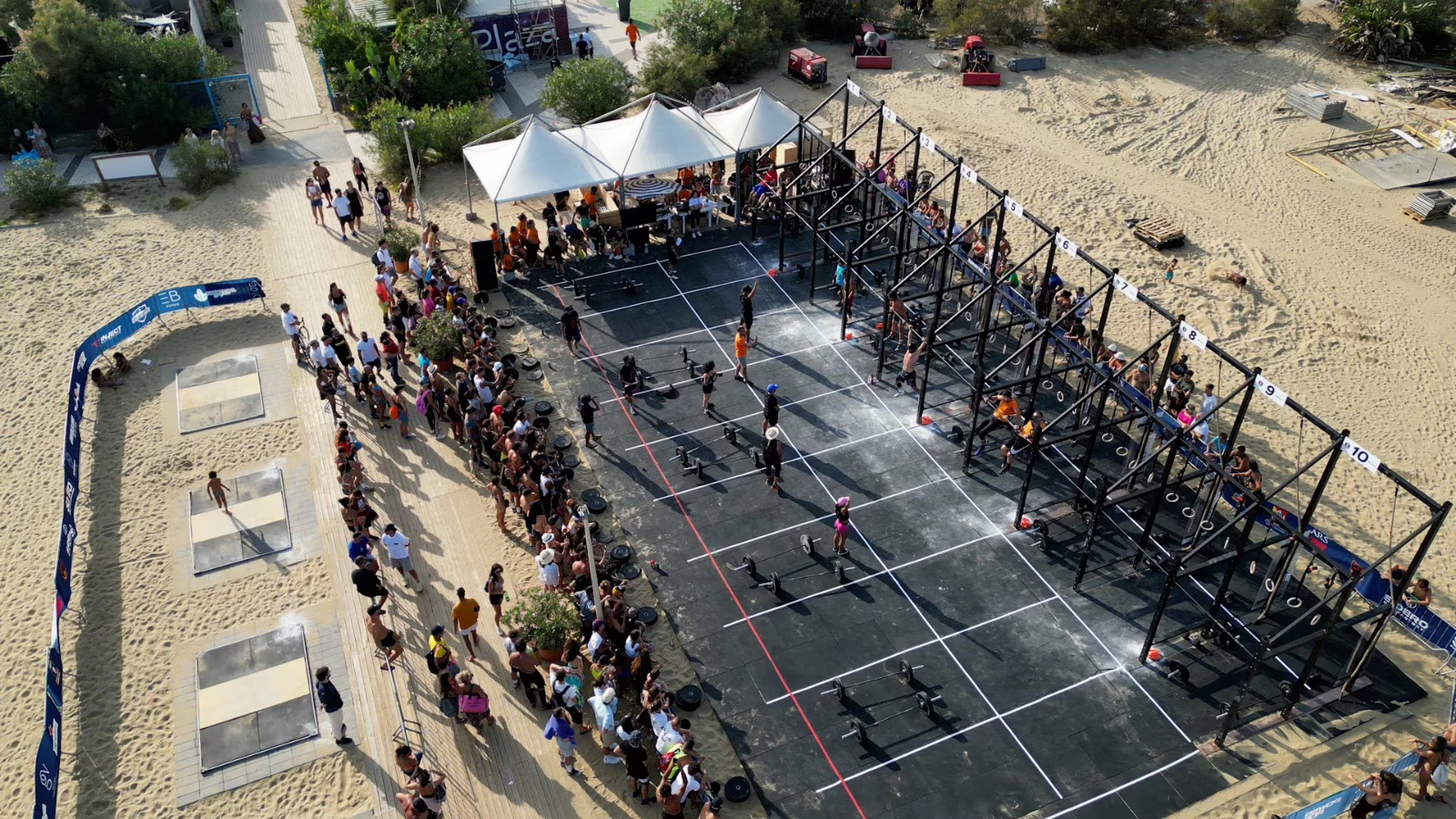 Sulla spiaggia della Plaja, con sua maestà Etna sullo sfondo, viene allestito il village: un’ area attesa atleti con ampi spazi dove poter montare gratuitamente un proprio gazebo, la zona pic nic con tavolini e panche, 5 punti ristoro distribuiti in tutta la location, area sponsor, area medica con operatori sanitari ed un fisioterapista a disposizione degli atleti e l’area warm up (riscaldamento atleti) attrezzatissima e tre campi gara ufficiali. Ovvero: il BEACH Floor che ha visto svolgere il più lungo workout di endurance misto, formato da vogatori, corsa e trasporti sulla spiaggia e nuoto; il WEIGHT Floor, formato da 5 pedane di Weightlifting dove è stato svolto un articolato workout di bilancieri pesanti ed il MAIN Floor, il più ampio campo gara realizzato su una spiaggia: 300 metri quadri di base solida poggiata sulla sabbia, su cui è stato costruito un campo gara da 10 Lane doppie.