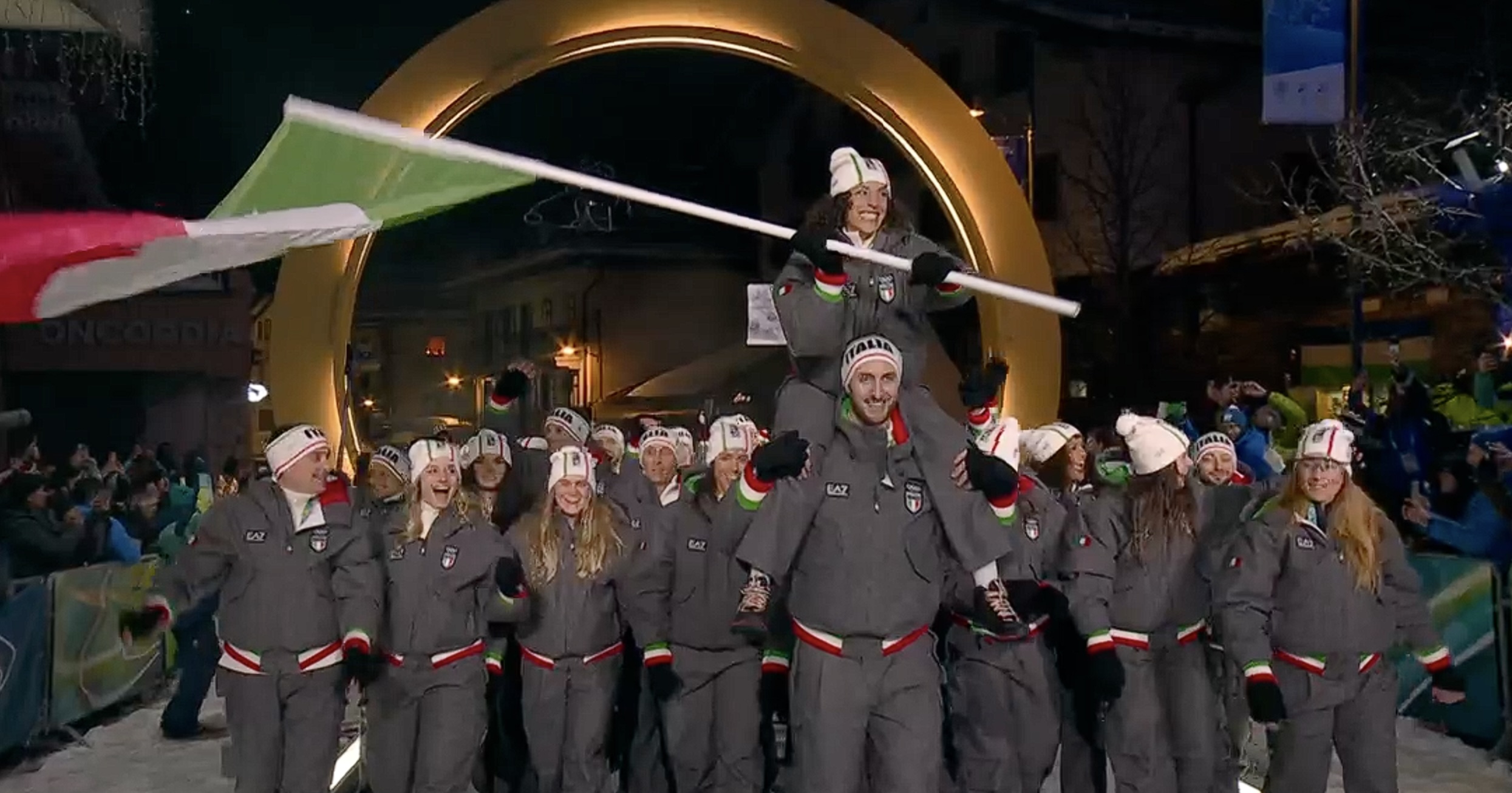 Il momento più atteso è stato l’ingresso dell’Italia, ultima nazione a sfilare. A San Siro il tricolore è stato portato da Arianna Fontana, alla sua seconda volta da portabandiera (“È speciale perché siamo a casa”, ha detto l’atleta valtellinese), e da Federico Pellegrino. In contemporanea, a Cortina, sventolavano la bandiera Federica Brignone e Amos Mosaner.